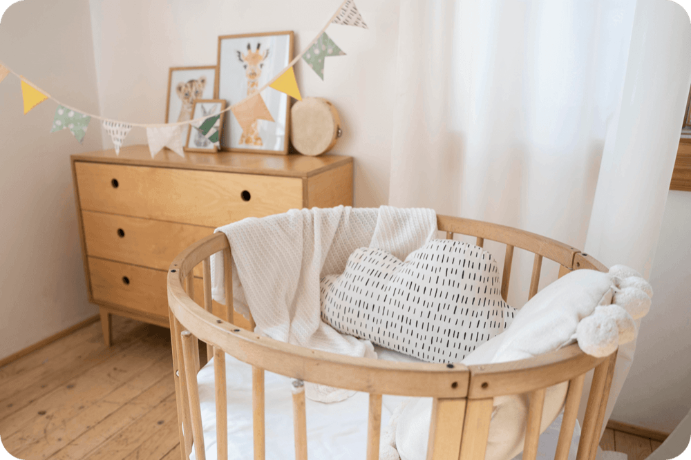 The nursery should be comfortable, safe, and supportive for your baby. Keep the temperature between 18–22 °C (64–72 °F), and humidity at 40–60%. Use soft lighting, especially in the evening and at night. Ventilate the room 2–3 times a day. The crib should contain only a mattress — no bumpers, pillows, or toys. Avoid antiseptics and air fresheners — natural microbes support immunity.