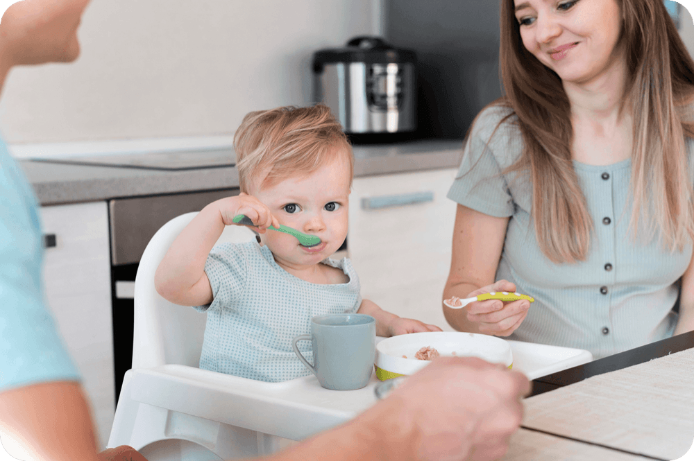 Family meals help your baby explore new tastes, learn to chew, and eat independently. Start offering adapted table food from 10–12 months if your baby is ready. Eating is a skill that develops gradually — through interest and shared family participation.