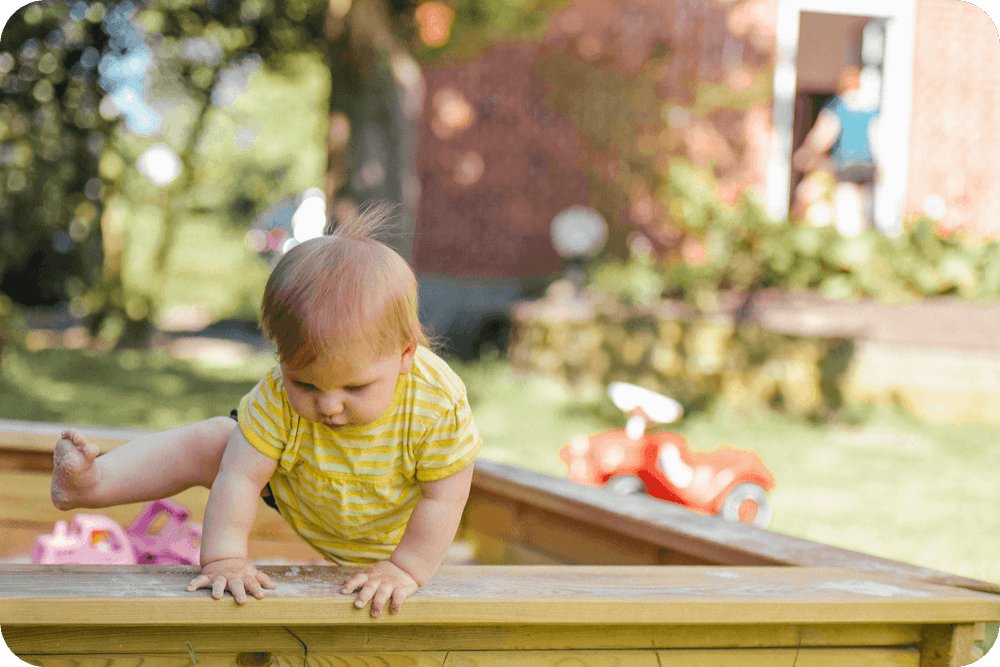 At 10–12 months, babies make a big leap in motor development — standing, taking first steps (often with support), and beginning to explore. A playground becomes a real movement lab: babies learn to balance, climb steps, slide down, and grip bars.
